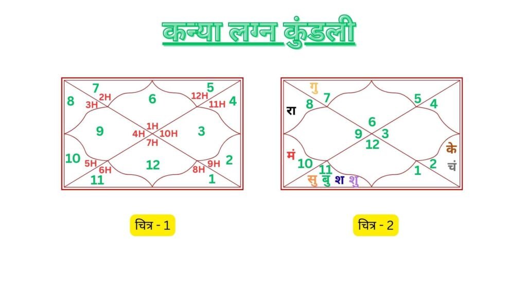 - ये कन्या लग्न की कुंडली है क्योंकि 1H = पहले घर में, 6(कन्या राशि) है; यहाँ चित्र – 1 में आपको समझाने हेतु क्रमशः 1H, 2H, 3H……. 12H लिखा है लेकिन कहीं कभी ऐसा लिखा नहीं होता है और जब हम आगे के लेखों में बात करेंगे तो हम भी नहीं लिखेंगे। लग्न क्या होता है? ये हमने कुंडली का लग्न: शक्ति और संघर्ष वाले लेख से समझा था।