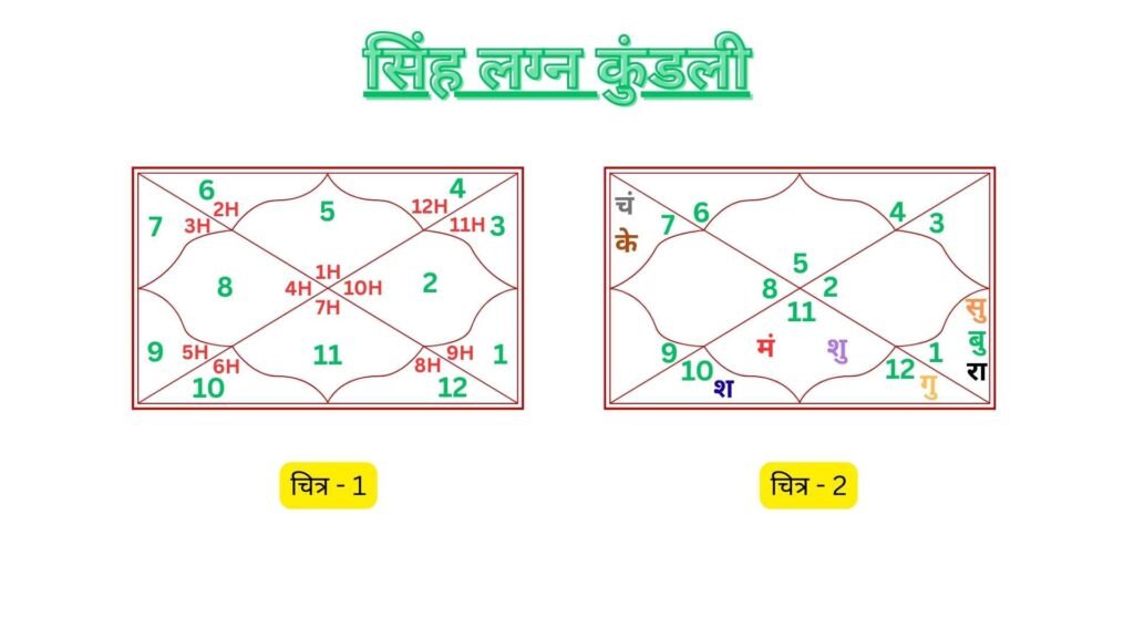 - ये सिंह लग्न की कुंडली है क्योंकि 1H = पहले घर में, 4(सिंह राशि) है; यहाँ चित्र – 1 में आपको समझाने हेतु क्रमशः 1H, 2H, 3H……. 12H लिखा है लेकिन कहीं कभी ऐसा लिखा नहीं होता है और जब हम आगे के लेखों में बात करेंगे तो हम भी नहीं लिखेंगे। लग्न क्या होता है? ये हमने कुंडली का लग्न: शक्ति और संघर्ष वाले लेख से समझा था।